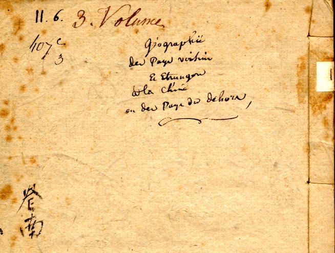 Unfortunately, our copy is incomplete. The first section (總卷) and pp.1-91 of the second section (內卷) are missing. We know that these two missing sections were contained in a single volume, because the three volumes we have are inscribed “2. Volume”, “3. Volume”, “4. Volume”, together with a description in French of their contents. I don’t yet know the ultimate provenance of these volumes, and can only be sure that they were in Oxford by the last quarter of the 19th century. It is possible that they are from the Chinese works once in the possession of Golius. The French inscriptions are of the 18th or possibly even the late 17th century. I think there is a good chance that the first volume might be in another European collection; my initial thought was the Bibliothèque Nationale, but it doesn’t appear to be in Courant’s catalogue.