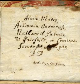 Almae Matri Academiae Oxoniensi Nathaniel Palmer de Fairfeild [sic] in Comitatu Somerset, Armiger, D.D.