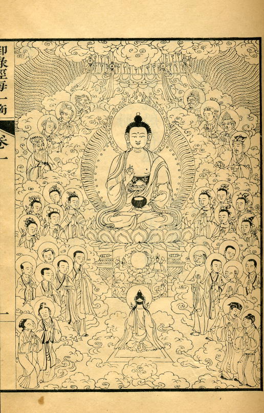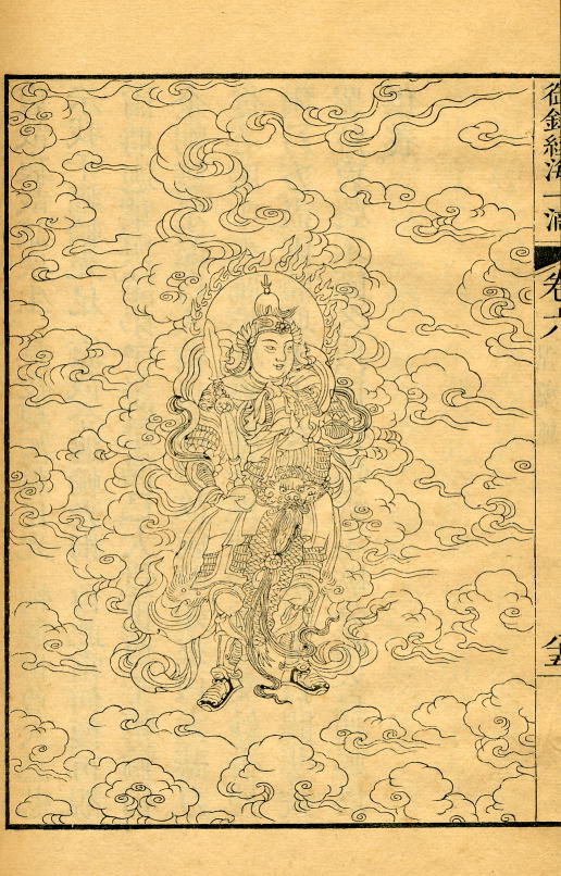 The edition was printed in the palace, and is a perfect example of the genre. It is modest in size, and printed on bamboo paper. The impression is crystal clear, and must have been taken from the blocks very soon after they were cut. There are two illustrations: the Buddha preaching the Law as a frontispiece, with Weituo (韋陀 or 圍陀), the guardian of Buddhist scriptures and libraries, at the end (as in the Guanyin ritual). These two illustrations are among the finest examples of Chinese woodcut of the period.
