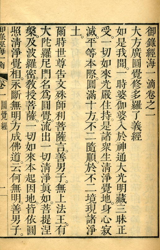 It was written by Yinzhen 胤禎, the third emperor of the Qing dynasty and a devout Buddhist. In 1732 he had the Yonghegong 雍和宮 palace in which he had lived before becoming emperor turned into the Lama Temple, which survives as one of Peking’s favourite tourist attractions, and in his final years instigated the publication of a number of Buddhist works. He personally compiled this distillation of twenty Buddhist sutras and aptly named it One drop from the sea of scriptures. It was printed in 1735, and in the same year he gave the order to compile the Longzang 龍藏 tripitaka, which was finished three years later under the Qianlong 乾隆 emperor in 1738. Unusually, as it contains no new material, One drop from the sea of scriptures was included in the Longzang, as the final work in the “works of this land” 此土著述 section (but here it is divided into 20 juan).
