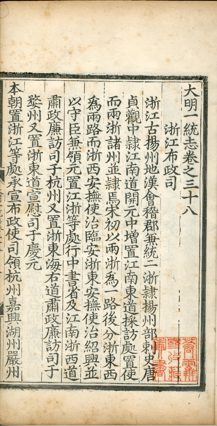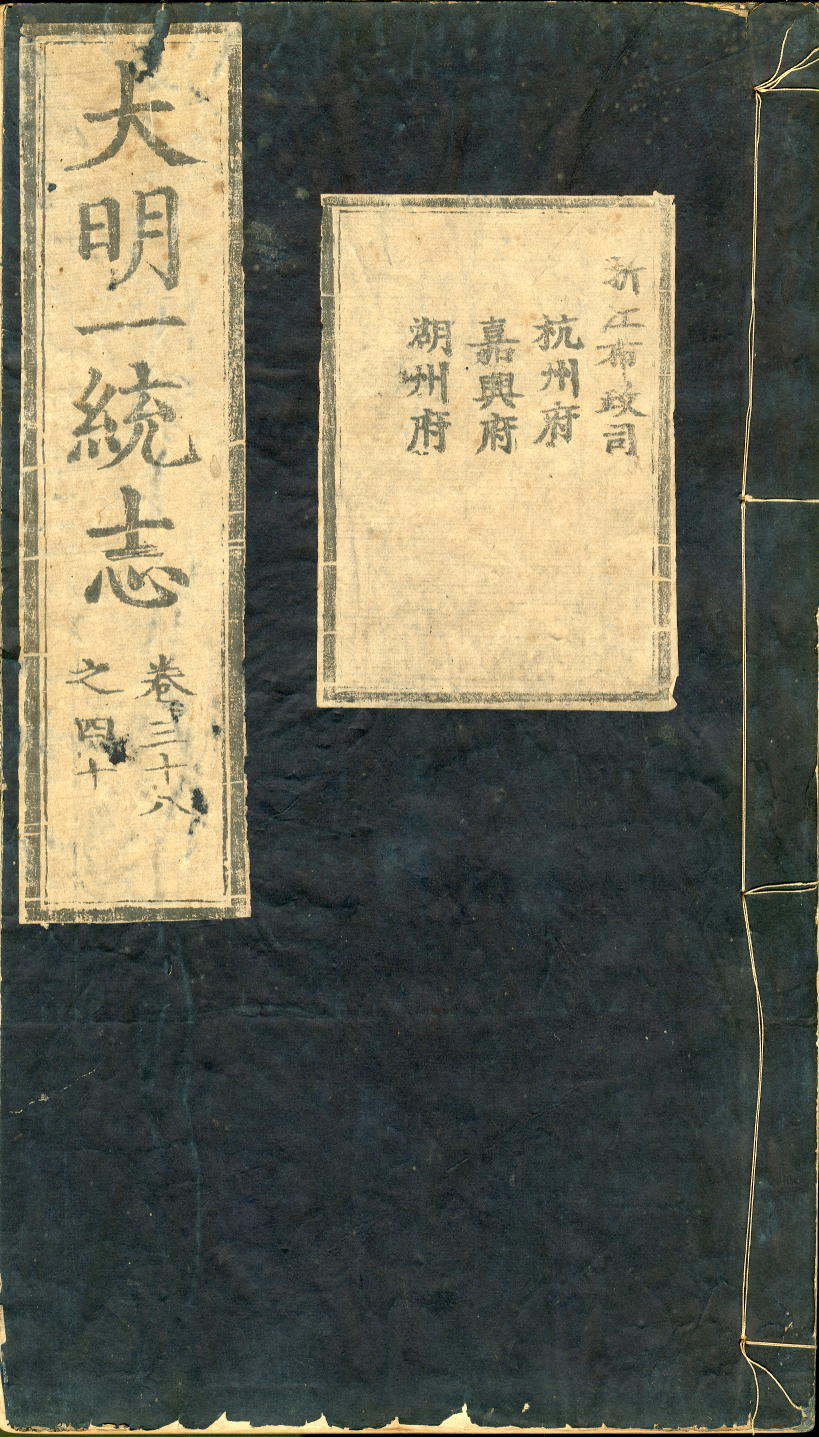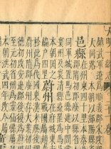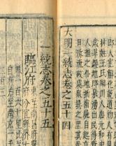 The edition may well have been cut in the Ming, but this copy was printed in the Qing, as the doctoring of the blocks makes clear. The publisher could hardly sell a survey of the “Great Ming” dynasty once the “Great Qing” had taken over, yet he was unwilling to lose his considerable investment in the printing blocks. So he excised the words “Great Ming” 「大明」 wherever they appeared, that is, in all the prefatory material, at the beginning and end of each juan 卷, and in the lower central column of each block 版心下. In the prefatory material and at the beginning of the first juan only, he inlaid a new piece of wood and carved the two characters tianxia 「天下」, so that the title of the book now became a “Survey of the whole empire”. The other chapter beginnings and endings simply read “Survey” 《一統志》.