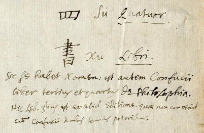 This inscription is found on the inside of the front cover, and was made in 1687 during the famous visit of Shen Fuzong, when the opportunity was taken of asking him to identify all the Chinese materials that were currently in the Library. Shen wrote the titles on to the items in Chinese characters, together with their romanised pronunciation. He then explained the books in Latin to Thomas Hyde (who was Bodley’s Librarian at the time) , and Hyde wrote it down. This inscription illustrates the process perfectly, clearly showing the different hands of Shen and Hyde. The inscription “四書 Lib.III.IV.” on the front cover was probably also made at this time.
