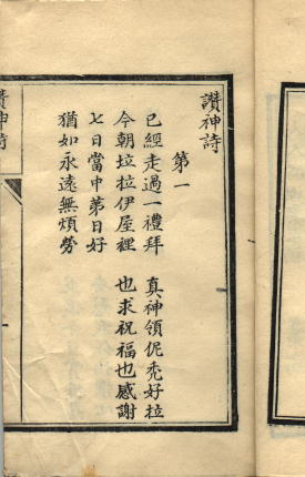 A hymnbook, which according to Wylie (Memorials, 220) contains 21 hymns and 3 doxologies translated by members of the mission and others. A version of the same text in Chinese characters (but still in Shanghai dialect) was published the following year, a sign, perhaps, that the system was not catching on as readily as envisaged. The Library also has a copy of this edition (Sinica 1264). The above illustrations show the two versions side by side.