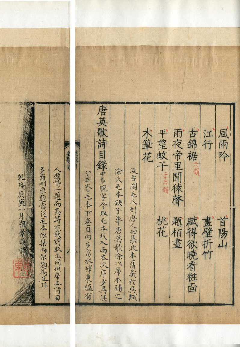 Of the works in Four Tang poets, the Poems of Wu Rong is the best edition. Mr Xi also printed this title in his Works of one hundred Tang poets [the edition used to replace it in Backhouse 477], but his text is lacking as many as two or three hundred characters, so that people can’t read it properly. So the Jiguge edition is to be highly prized.