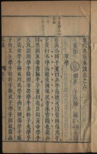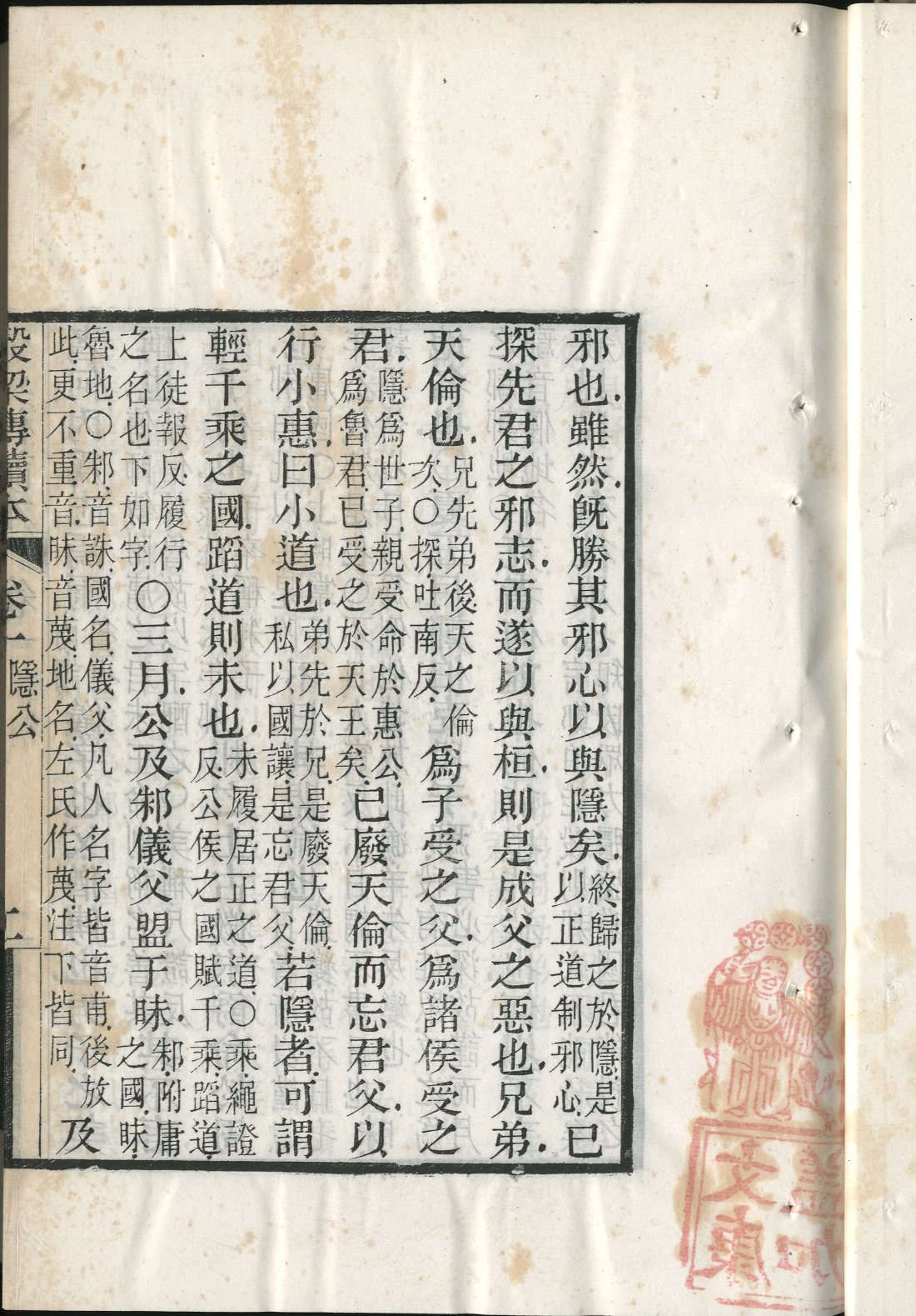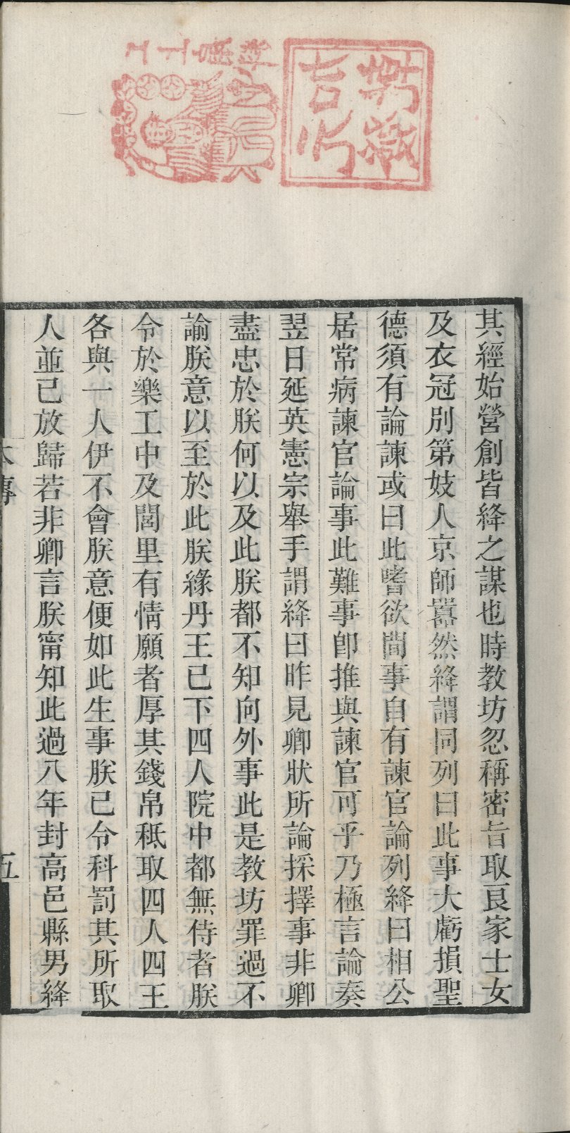 The first change to the blocks must reflect a change of ownership between 1635 and the fall of the Qing, and is evidenced by the excision of the name of the printing shop Dongguange 東觀閣 from the lower banxin 版心下. This is exemplified by a copy in Liaoning University: