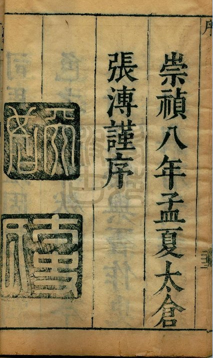 But Zhang Pu also wrote the preface, or at least it is ascribed to him. Extraordinarily, here his name has simply been replaced with that of Chen Renxi without any change to either the text or the printed seal Tianru 天如 (Zhang Pu’s zi 字). The following two impressions are both from the same block. That on the right is from the copy of the original 350-juan edition in Liaoning Daxue, and that on the left is from the Backhouse copy of the 319-juan version, the block having degraded somewhat in the meantime and the four characters 「太倉張溥」having been replaced with 「陳明卿氏」:
