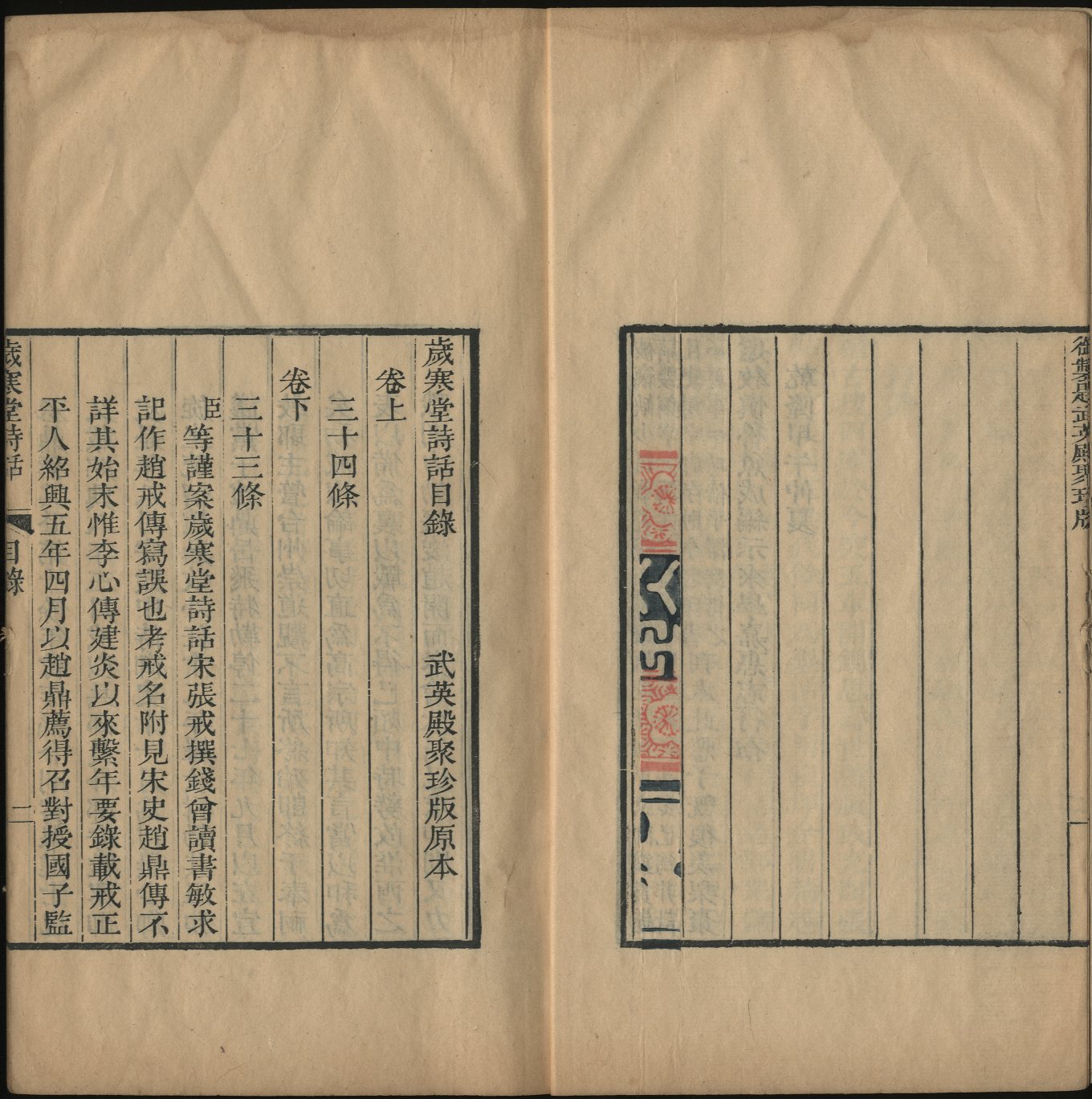 The reason why the final 31 juan had been omitted and all evidence of them excised from the table of contents block must surely be because they were concerned with the northern border regions (御邊) and the barbarians that inhabited them (夷狄). Once these barbarians had become the new dynasty, whoever owned the blocks at that time clearly felt that those chapters had to go (although a century later the complete 350-juan version was included in Siku quanshu 四庫全書).