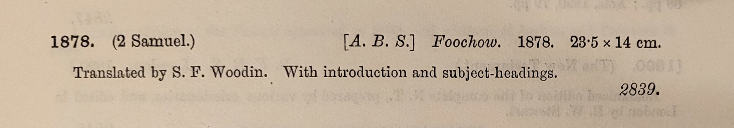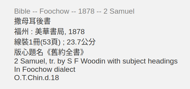 The Bibles, like all the other missionary publications, present cataloguing problems as they are neither Chinese nor English, but hybrid in both form and content. Unlike traditional Chinese publications, in which what appear to be title-pages are no such thing (see section 3 of this blog entry), in the missionary publications, which were written and printed by foreigners, they really are title-pages of the western type and as such are what cataloguers call the “principal source of information”. And as the publications are usually more western than Chinese in presentation, I have expressed the imprints not as a single sentence of classical Chinese, but with the more familiar ISBD punctuation: “place : publisher, date”. Also, the cataloguing language in the Serica Project is Chinese, but again the normal rules simply can’t be applied. Just as the English translation of the note 「版心題名《舊約全書》」 is long and inelegant, so the English “2 Samuel, tr. by S F Woodin” makes little sense in Chinese except to the initiate. So my cataloguing language is mixed.