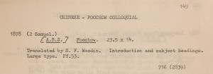 I have used the headings and filing order of the two Bible Society catalogues, so that the word “Bible” (not necessary in their case, as the catalogues are of Bibles only) is followed by the language (usually called “dialects” in Chinese, even when they are mutually unintelligible), then the date, then the part of the Bible where necessary: it usually is, as most editions are not of complete Bibles. I have used the 19th-century spellings of the dialects and place names (Foochow, Amoy, &c) not out of antiquarianism, but to be consistent with the two existing published catalogues and the usage in all contemporary documentation.