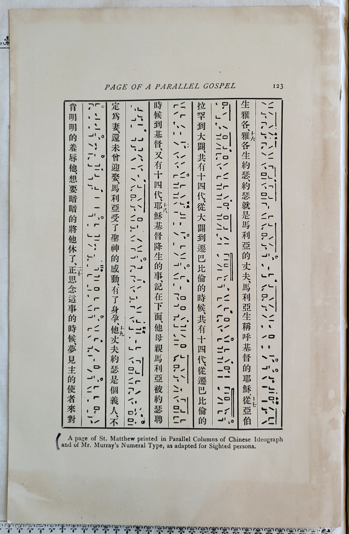 William H Murray (1843-1911), deeply moved by the fate of the blind in China, developed a Braille system based on numerals which enabled blind people to learn to read in a matter of weeks and used it to produce Bibles, hymnals, and other books.